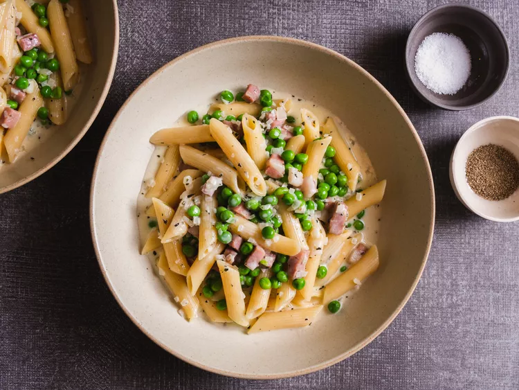 Rigatoni with applewood smoked bacon, onions, tomato sauce & Parmigiano